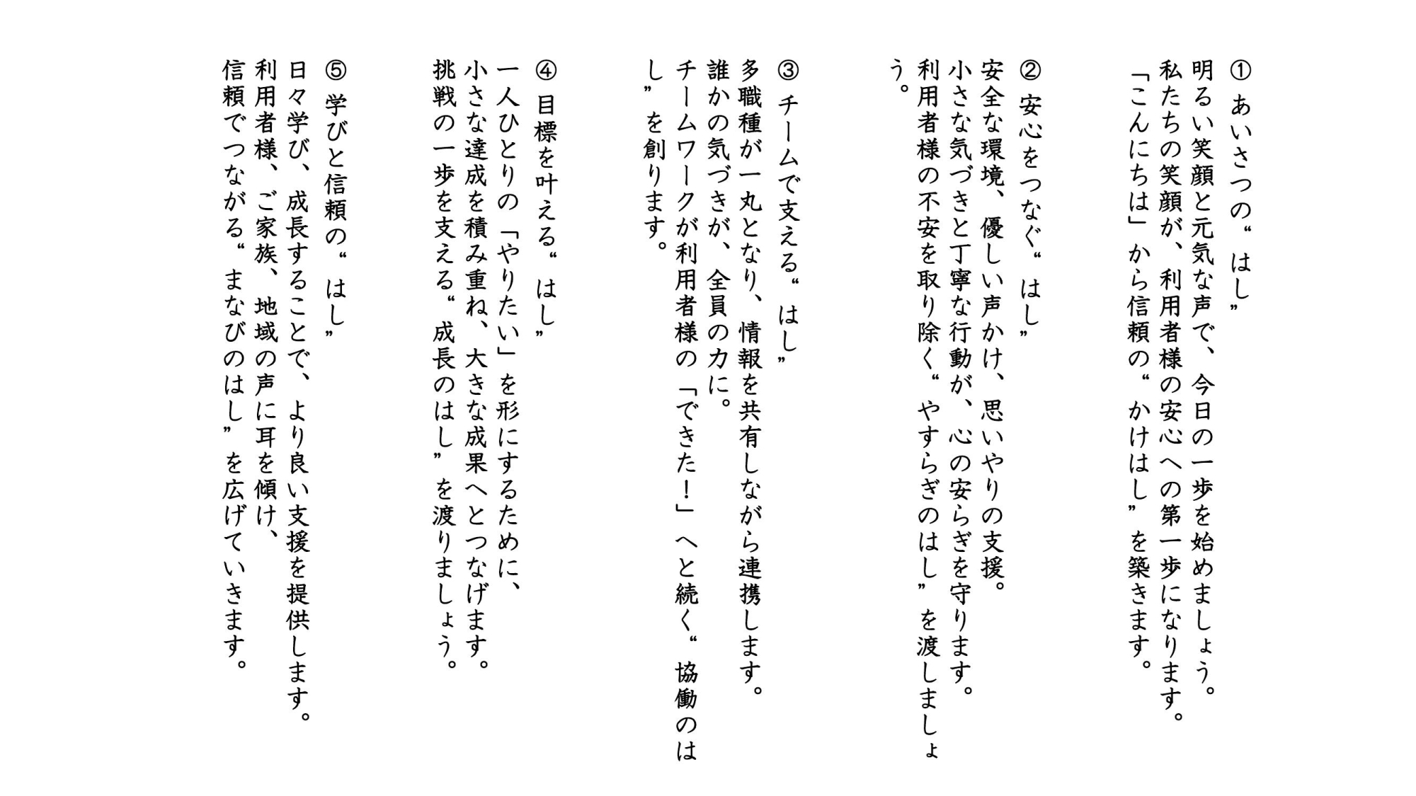 五つの“はし”は、私たちが地域と利用者様をつなぐための心の道筋です。